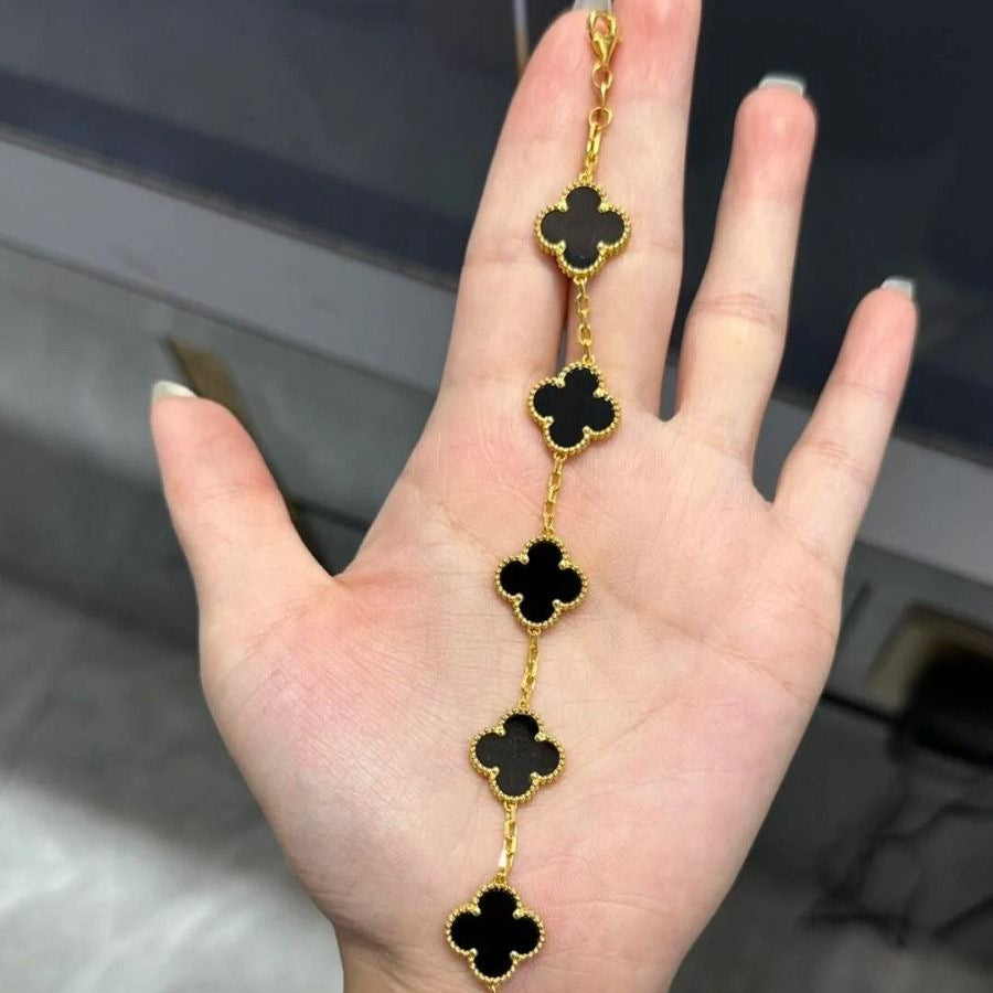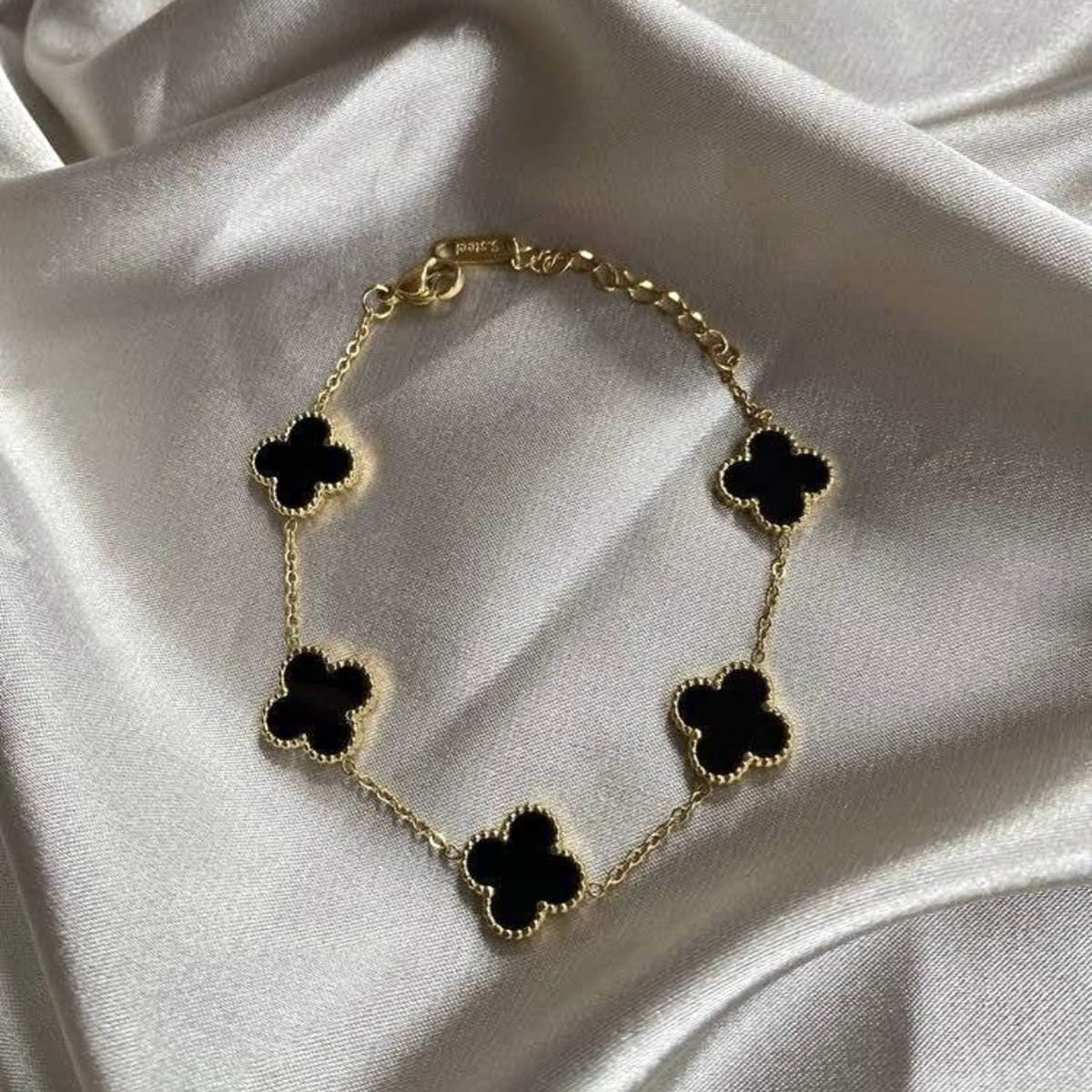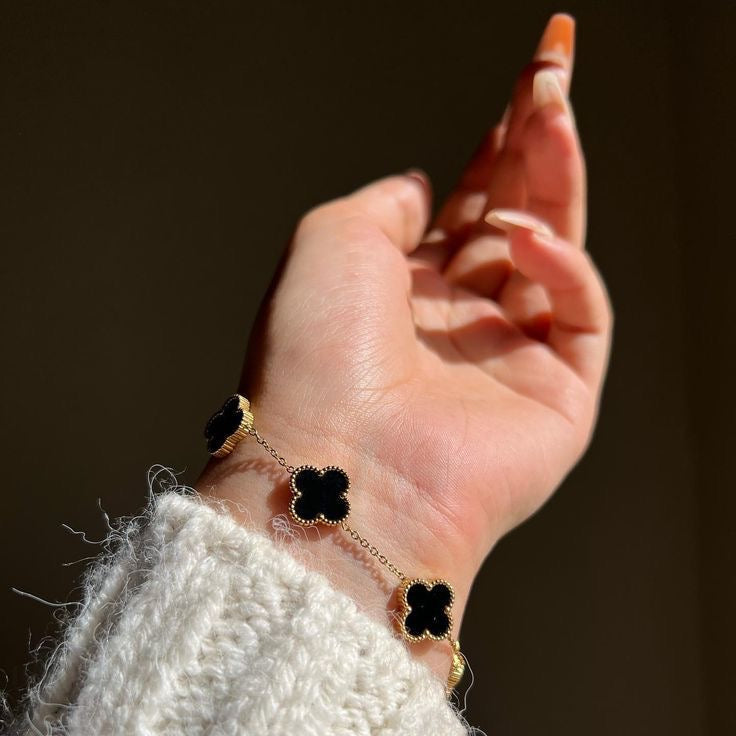 Siyah yonca detaylarıyla dikkat çeken bu özel bileklik, hem şıklığı hem de anlamı bir arada sunar. Premium parlak altın kaplama zinciri sayesinde uzun süre ilk günkü görünümünü korur. Her bir yonca motifi, pozitif enerji, şans ve zarafeti temsil ederek bileğinizde hem modern hem de anlamlı bir duruş oluşturur.